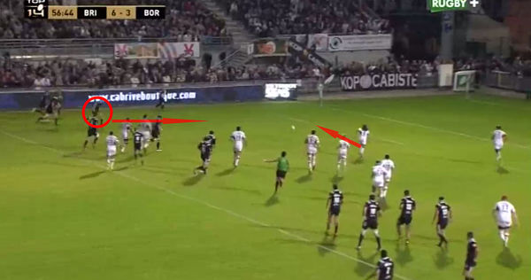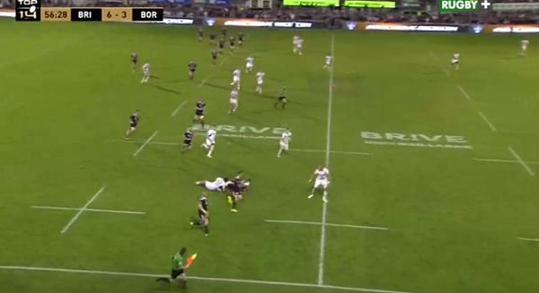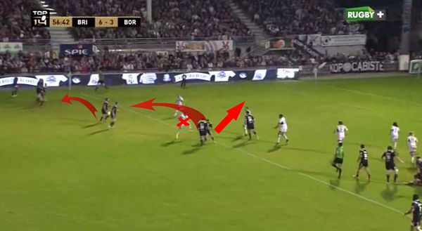 Iribaren a ouvert sur Gaëtan Germain, venu s'intercaler dans la ligne. Le soutien est présent au grand large. Le ballon doit vite atteindre les extérieurs pour que Brive profite de la désorganisation défensive des bordelais.