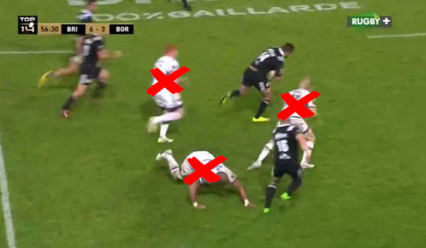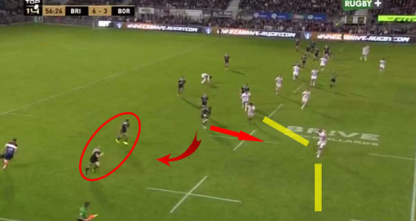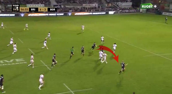 Germain a servi Méla qui a transmis ensuite à Waqaniburotu. L'international fidjien accélère et a plusieurs choix qui s'offrent à lui : soit aller défier Saili soit ouvrir vers le duo Mafi - Da Ros. Le troisième ligne bordelais doit couvrir deux zones de terrain.