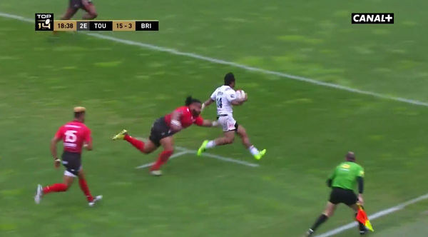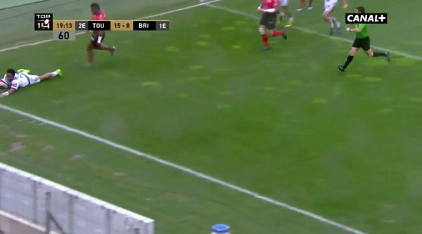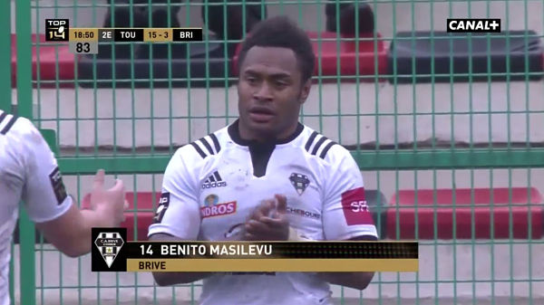 A l'image de son compatriote et adversaire Josua Tuisova (qui ne peut que constater les dégâts) quelques instants auparavant, Benito Masilevu se fait plaisir en marquant son essai. Le briviste s'offre un beau plongeon qui le fait terminer au pied des tribunes. Une belle manière pour fêter un premier essai en Top 14 depuis avril 2015.