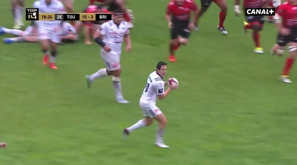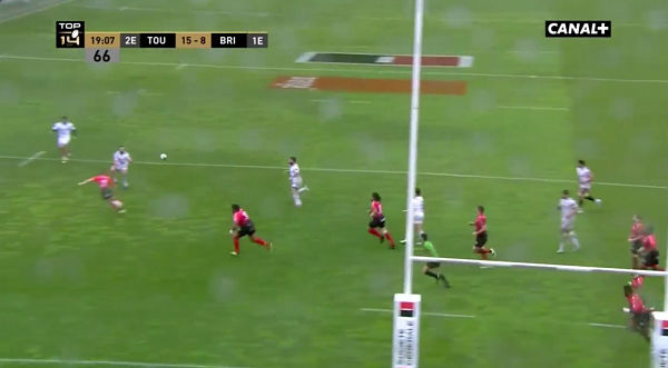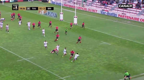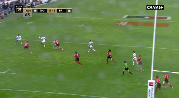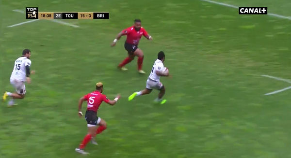 L'ouvreur saute Benjamin Pètre pour trouver Arnaud Mignardi. En un mouvement, le centre briviste va littéralement faire basculer l'action. Drew Mitchell monte en pointe sur lui mais ne peut empêcher la passe sur un pas. Mais ce n'est pas simplement une passe, c'est une sautée vers Masilevu qui va se retrouver en 1 contre 1 face à Delon Armitage.
