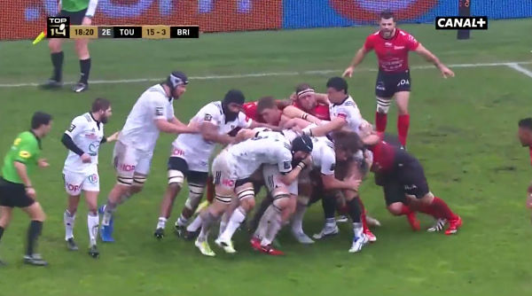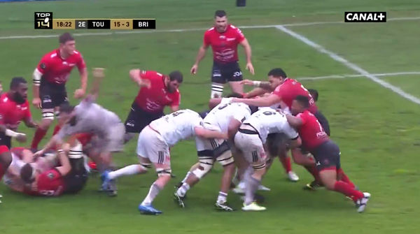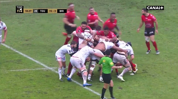 Le maul s'enclenche en deux temps. La première fois, la défense de Toulon contre bien l'édifice et le fait reculer. Cependant, les avants corréziens ont choisi de subir pour mieux repartir dans un second temps et avancer inexorablement vers la ligne des 22 mètres.
