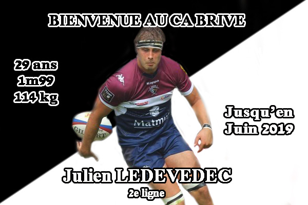 Formé à Toulouse, le polyvalent 2e/3e ligne a débuté sa carrière dans la ville rose mais il a vraiment explosé au CA Brive en disputant 98 rencontres en 4 saisons. "Lede" a continué sa progression au sein de l'effectif de Bordeaux où il a disputé 51 matchs en 2 saisons (et il reste encore quelques matchs). Avec la future retraite d'Arnaud Méla, Julien Ledevedec est prêt pour reprendre le costume de leader du pack corrézien.
