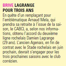Ce lundi, Midi Olympique annonce que Damien Lagrange, 2e ligne de La Rochelle, devrait s'engager pour 3 ans à Brive !