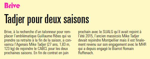 Brive poursuit la construction de sa future équipe et va s'appuyer sur le vivier de la Pro D2. Un vivier qui a porté ses fruits du côté de la Corrèze. Longtemps courtisé par Montpellier, Mike Tadjer va finalement rejoindre le Top 14, dans un club proche d'Agen : le CA Brive.