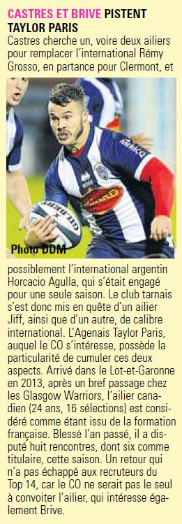 Castres est à la recherche de renforts à l'aile, avec notamment l'officialisation du départ de Grosso vers Clermont. Taylor Paris est un ailier très performant et qui possède le statut de JIFF, un statut de plus en plus recherché. Si Castres est sur le dossier, Brive l'est également. Le CAB se montrera-t-il plus persuasif que le CO pour arracher l'international canadien ?