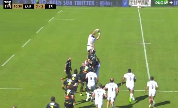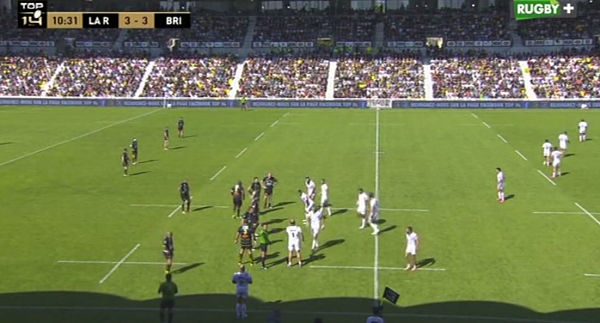 Contre le vent lors de cette première période, Brive est bien rentré dans la rencontre. Le score est de 3-3 et les brivistes ont une touche à négocier, légèrement dans le camp adverse. Brive choisit une touche complète et place ses 3/4 sur le grand large. Les 3/4 rochelais se placent en conséquence.