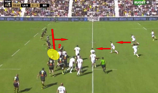 C'est finalement Iribaren qui est choisi. Laranjeira et Tuatara proposent des solutions tandis que la ligne de 3/4 rochelaise monte en ligne pour stopper cette attaque briviste. David Roumieu (2) doit sécuriser la zone entre la zone de la touche et sa ligne de 3/4 (cercle jaune). Une zone peut être un peu trop grande pour le talonneur ?