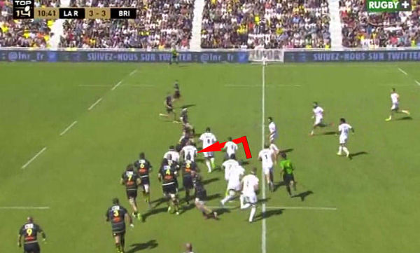 Iribaren marque peut être un léger temps d'arrêt mais Lapeyre tente le tout pour le tout : couper la ligne de passe vers Tuatara. Soit c'est réussi soit c'est un essai quasiment tout fait pour Brive. En voulant couper la ligne de passe, Lapeyre commet un en-avant et stoppe l'action briviste alors que Masilevu et Ugalde arrivaient lancé sur la droite de Tuatara.