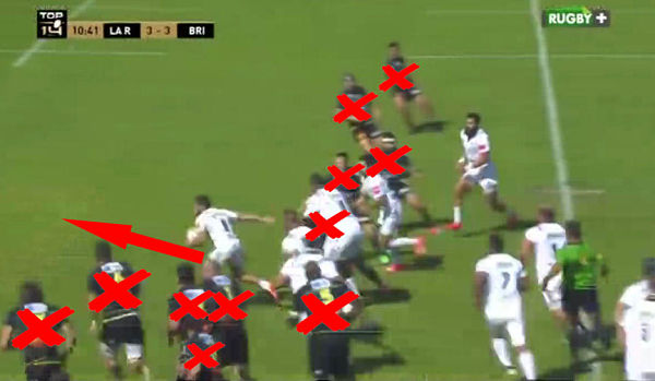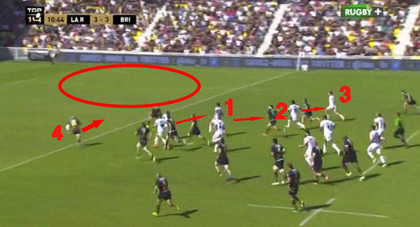 20 mètres de course plus loin, nouvelle décision à prendre pour Iribaren. Benjamin Lapeyre est en position de dernier défenseur (même si Lacroix (4) est en couverture mais sûrement trop court) tandis que Tuatara (1), Masilevu (2) et Ugalde (3) arrivent en soutien. L'action idéale parait nette : fixation de Lapeyre, passe vers Tuatara qui s'engouffre dans la zone libre. Si des rochelais reviennent, Masilevu et Ugalde sont là en soutien pour conclure l'action en essai.