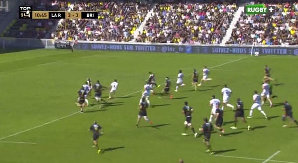 Il n'y a pas forcément de décalage sur les extérieurs, du fait de la belle montée défensive de La Rochelle. Mais il y a un duel à jouer à l'intérieur : la vitesse d'Iribaren face à Roumieu. Le demi de mêlée lit bien le jeu et décide de casser sa ligne de course pour rentrer intérieur et tenter de prendre à contre-pied le talonneur rochelais.