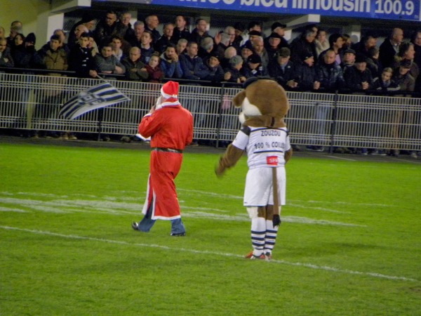 Nous sommes installés en tribune. Surprise !! Le père Noël est sur le terrain avec Zouzou qui le regarde tendrement. On pourrait imaginer qu'il attend lui-aussi une surprise du père Noël. Mais Zouzou, regarde bien ! C'est juste notre speaker qui est déguisé en père Noël.