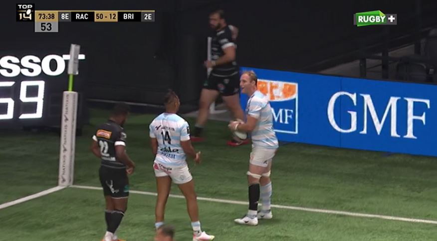 Le match se passe et arrive alors le temps de cadeaux. Alors que Teddy Thomas s'en va inscrire un doublé, l'ailier du Racing décide d'offrir l'essai à son coéquipier.