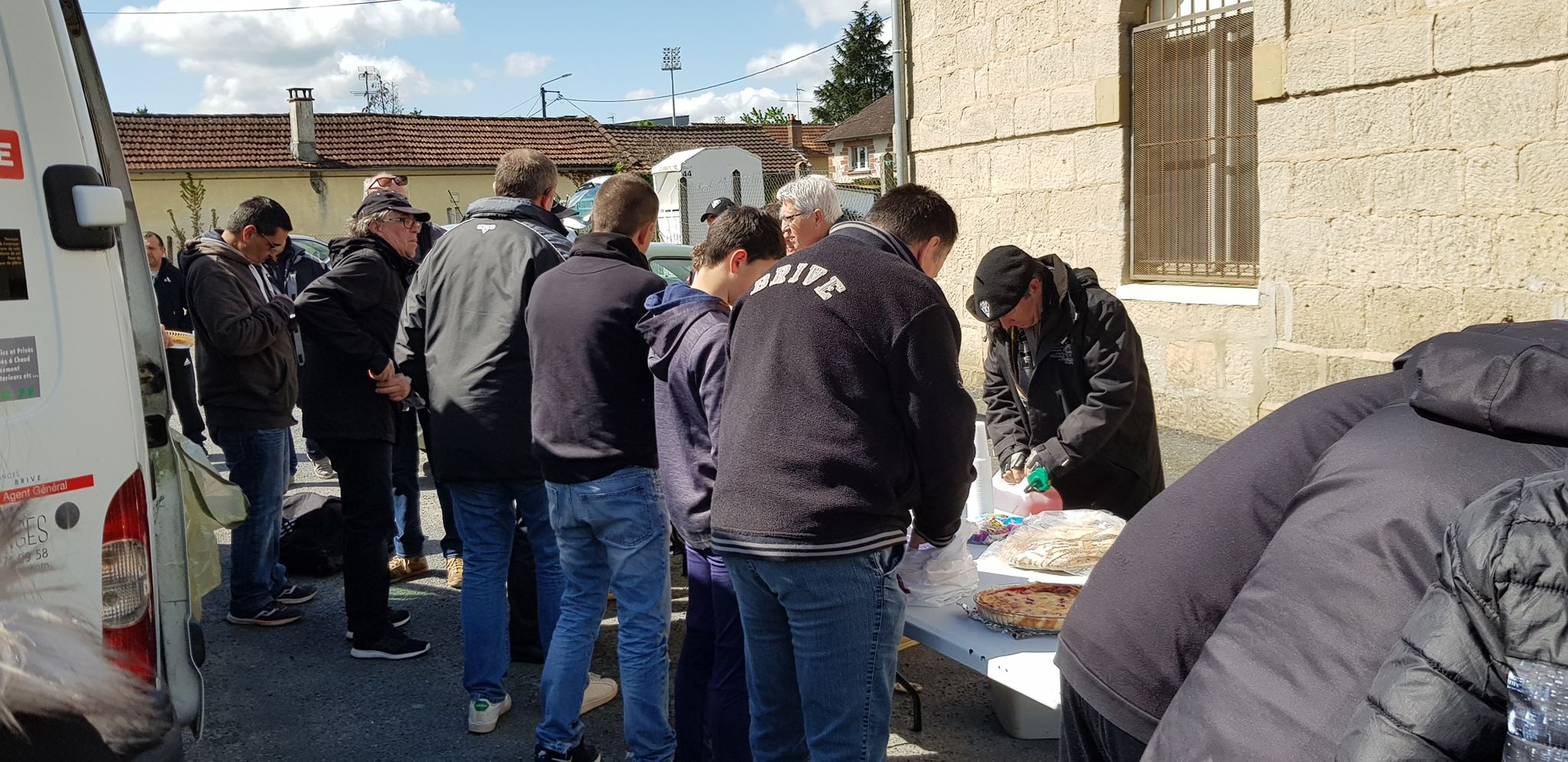 Nous voilà avec les 100% Coujou qui nous ont invités au casse-croute avant d’aller à la haie d’honneur de 12h30. On est nombreux, tout le monde ne parle que de ce match, fait des calculs…. Mais c’est la joie et l’enthousiasme qui règne. Le rugby, le CAB, notre club, notre passion.