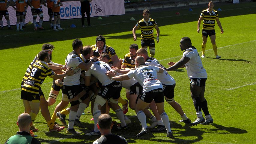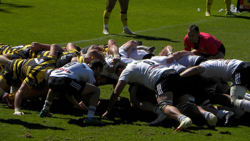 C’est là que va commencer une séquence interminable quand, suite à un plaquage haut montois, les brivistes choisissent la pénaltouche. Nous, on est d’accord. Il faut encore aller à l’essai pour donner un coup au moral des montois, et pour le bonus offensif ! Touche, ballon porté corrézien, mais les montois ont encore du jus et défendent bien. Faute montoise, mêlée briviste à 5 mètres. C’est du tout cuit, avec la mêlée qu’on a, pas de soucis. Pourtant, les landais tiennent le choc, l’essai ce n’est pas pour tout de suite. Mais Otar Giorgadze, oui encore lui, réussit à aplatir derrière la ligne. L’essai est là, c’est la joie… qui retombe vite. Pour l’arbitre, une main montoise trainait par-là, on revient à une nouvelle mêlée dans les 5 mètres. Cette fois-ci, ce n’est pas la même. La mêlée briviste transperce les montois, gros effort briviste qui paye puisque Damien Lagrange aplatit le 3ème essai ! Là, ce ne sont pas des cris, mais des hurlements. Les gens sont debout, les drapeaux volent… on l’a notre 3ème essai ! Pas de soucis du côté de la transformation (24-6, 28’).