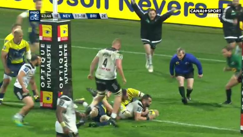 26’, suite à une incompréhension en touche des neversois, Brive reprend possession du ballon et Samuel Marques trouve une touche dans les 22 adverses. Tout va vite s’enchainer à ce moment. En-avant de Nevers sur la touche, mêlée briviste conquérante et essai de Joris Jurand !!! Tout s’est passé si vite qu’on est resté presque cloué sur nos sièges jusqu’à cette explosion de joie quand Jurand a aplati. Magnifique essai de cette jeune recrue, le drapeau s’agite comme au stade, on est debout les poings en l’air ! On attend la transformation, mais elle est manquée (3-11, 28’). On respire, les sourires reviennent. On peut le gagner ce match !