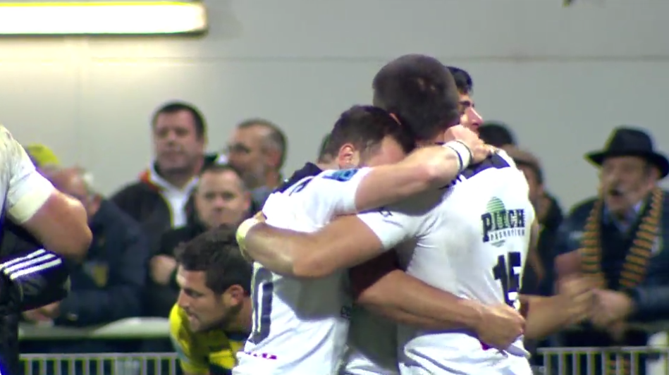 Brive commence fort. Grosse poussée, bonne passe de Marques pour Axel Muller, ça chauffe. On approche nos yeux au maximum de l’écran pour ne rien perdre de cette action. On est à 5 mètres Jurand est proche de la ligne mais Saïd Hireche récupère et aplatit ! Ca crie plus fort qu’avant. On a encore la bouche pleine, debout devant cette télé. Transformation de Laranjeira, (11-25, 44’). On ne peut s’empêcher de se serrer dans les bras.