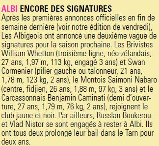 Dans Midi Olympique, on apprend les arrivées pour 3 ans de William Whetton et pour 2 ans de Swan Cormenier :