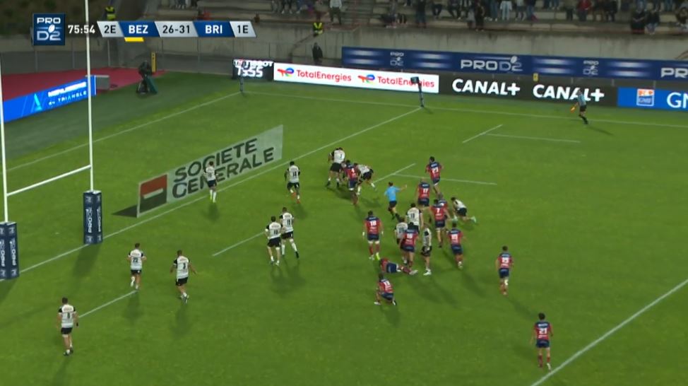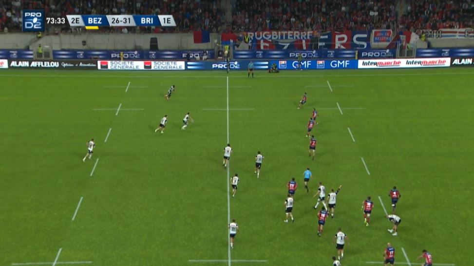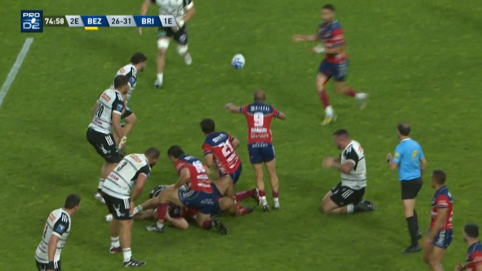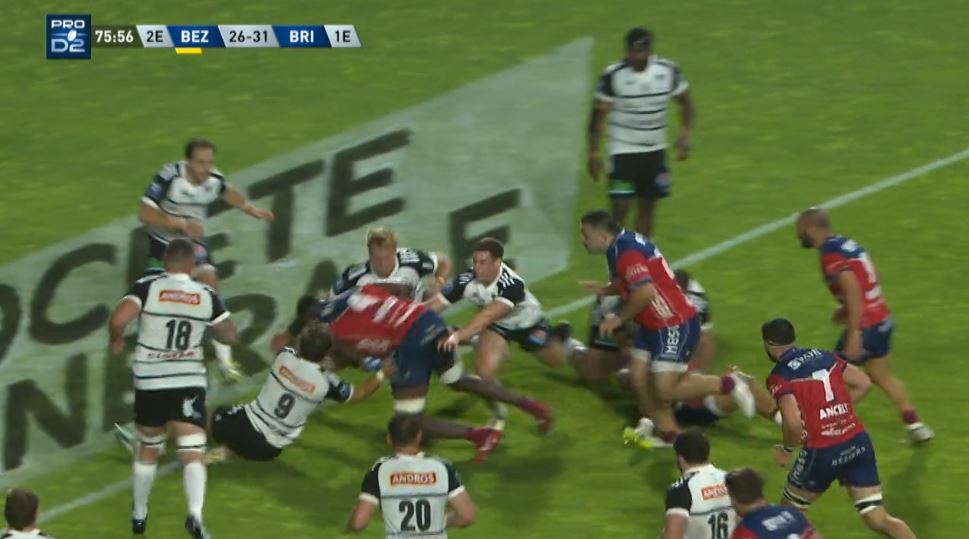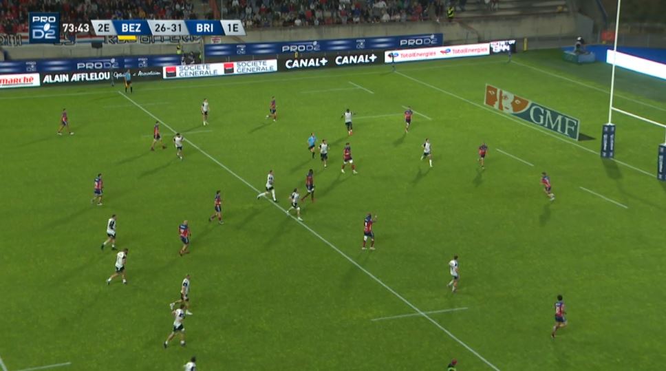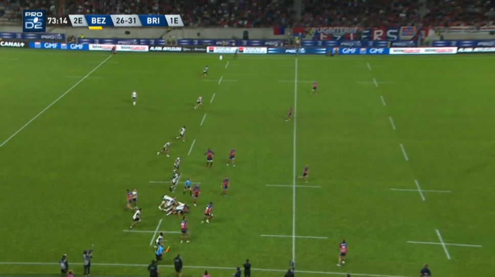 L'ailier accélère, casse le plaquage de Julien Delannoy et passe au sol sur la ligne des 22 mètres. Béziers avance dans l'axe. Petit à petit, cela avance. La défense briviste ne craque pas mais peine à ralentir l'avancée. Sur un 6e temps de jeu, Marques passe à plat pour Pierre Gayraud. L'arbitre ne dit rien. C'est assez limite mais ce n'est pas signalé.