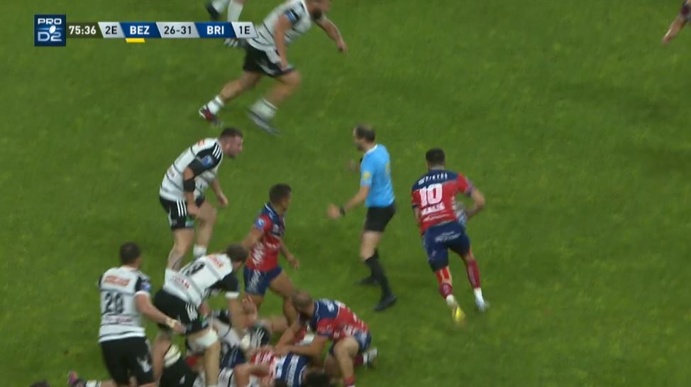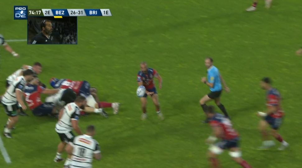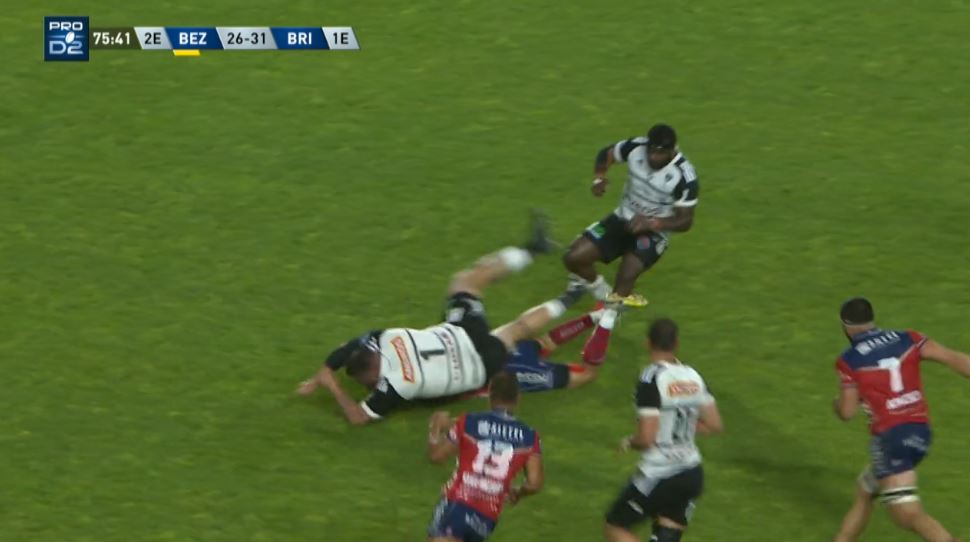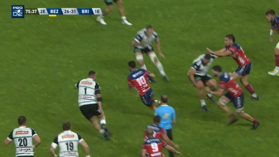 Il s'en va crocheter Nicolas Krone à l'entrée des 22 mètres mais est déséquilibré par l'arrière briviste. Brennan se couche sur le biterrois et se fait sanctionner par Mr Nuchy. Avantage en cours.