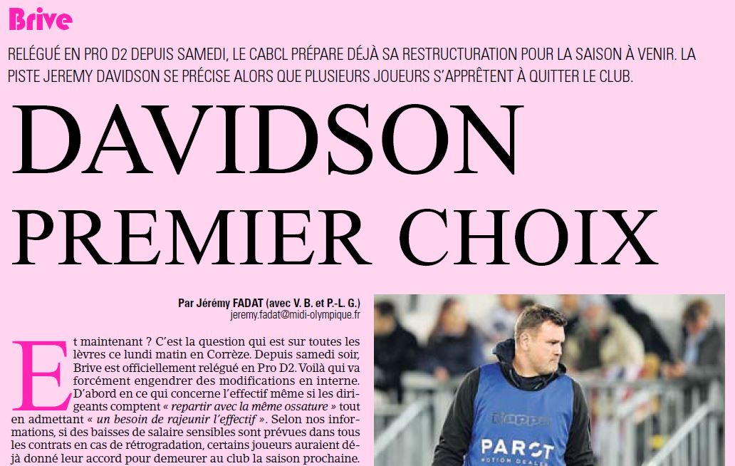 Pour le prochain staff, Simon Gillham a confirmé son duo d'entraineurs samedi soir après la rencontre au Stade Français mais la piste menant à Jeremy Davidson est toujours d'actualité. Sauf que le nord-irlandais est sous contrat jusqu'en 2020 à Bordeaux donc il faudra négocier une libération. Le nom de Jean-Frédéric Dubois a été évoqué mais cela n'aboutira pas car il devrait rejoindre selon toute vraisemblance Montauban.