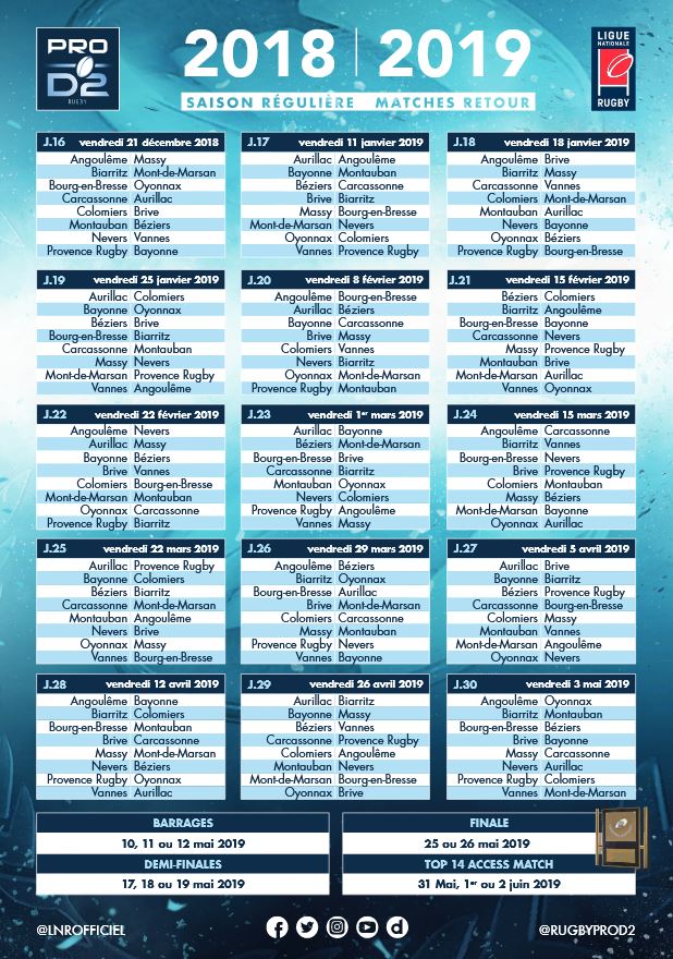 - un autre match plein de saveurs contre Montauban lors de la J9 (26 octobre) à Brive toujours (retour le 15 février lors de la J21)