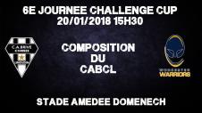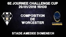 Voici la composition des deux équipes pour le match CA Brive - Worcester (coup d'envoi à 15h30, arbitre : Mr Dan Jones)