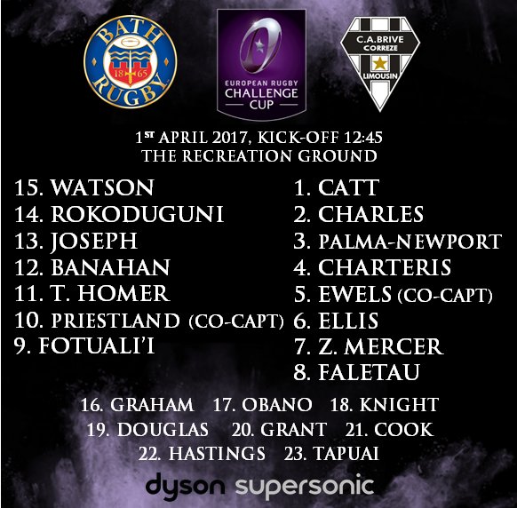Pour cette réception, Bath ne peut compter sur Ford (repos), Batty (genou), Brooker (pas qualifié), Lahiff (ischios), Stooke (cou), Denton (pas qualifié), Freuan (genou), Attwood (genou) et Louw (cou).