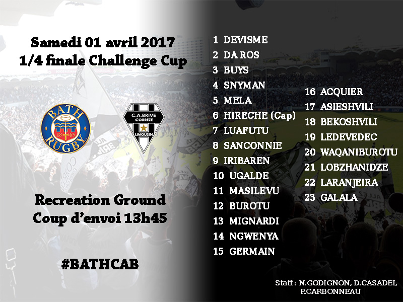 Voici le XV de départ du CA Brive pour le déplacement à Bath :