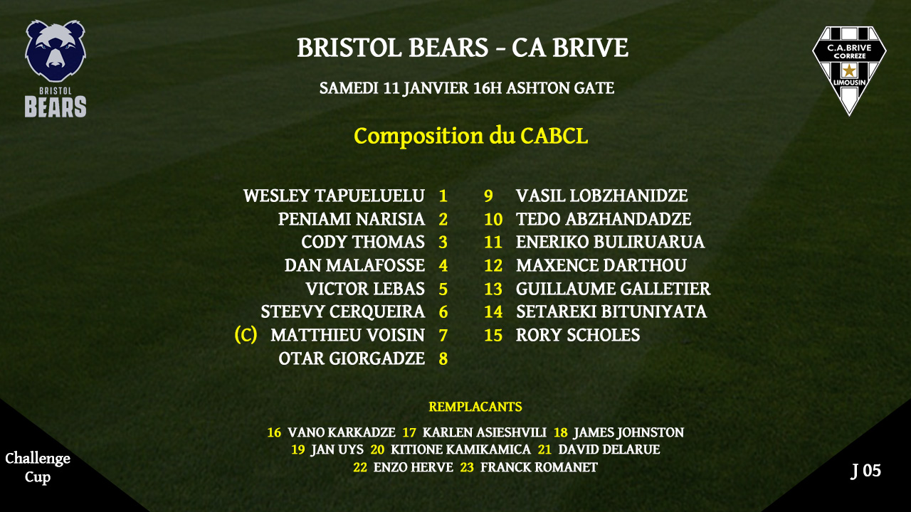 Voici le XV de départ du CA Brive pour le déplacement à Bristol :