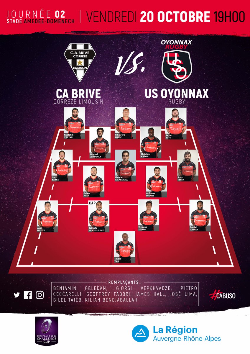 Pour ce déplacement, Oyonnax sera privé de Ursache, Debaty, Ruiz, Sobela, Veau (suspendu), Inman (ménisque), Lasmarrigues (épaule), Etienne (côte). Ce sera l'occasion de revoir l'ancien briviste Kevin Buys, titulaire pour cette rencontre à Oyonnax.