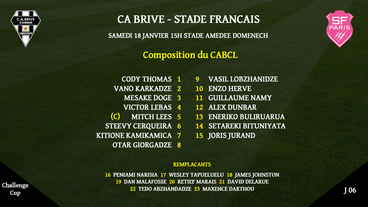 Voici le XV de départ du CA Brive pour la réception du Stade Français :