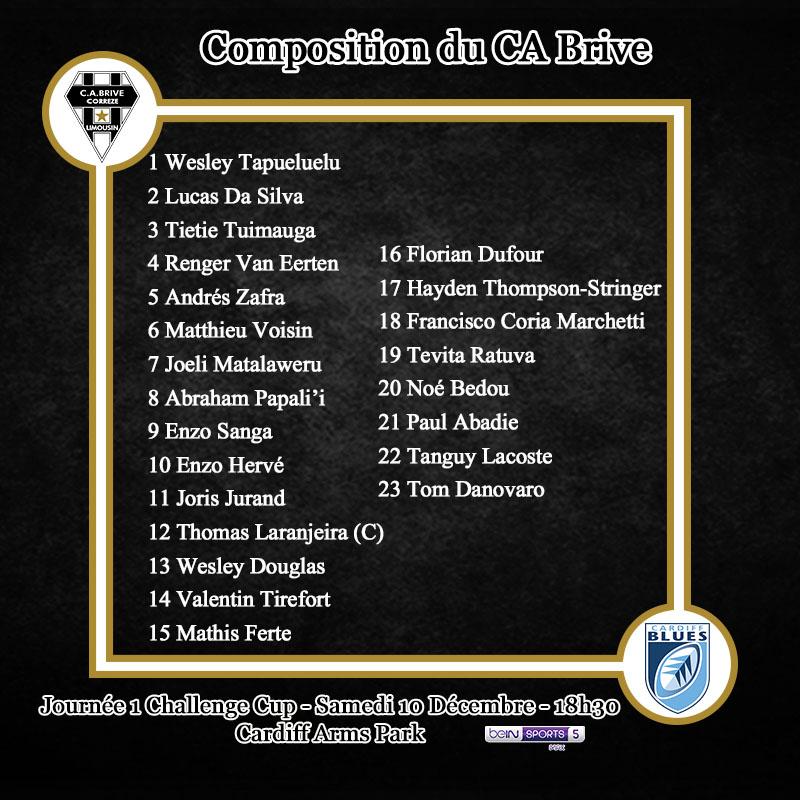 Voici le XV de départ du CA Brive pour le déplacement à Cardiff :