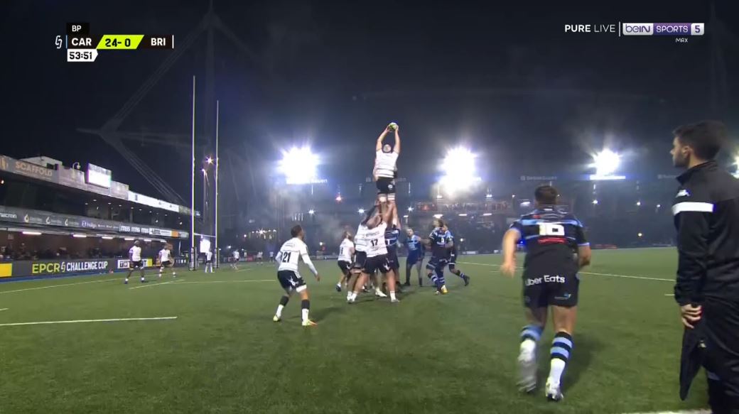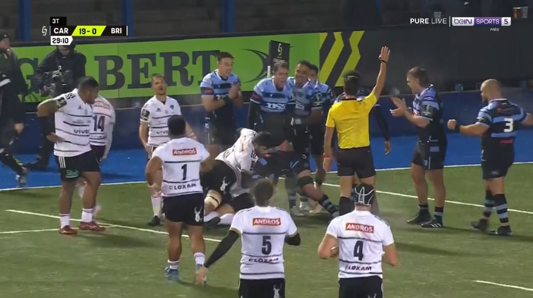 Cardiff met la main sur la partie dès le coup d'envoi. Les gallois attaquent rapidement dans les 22 mètres brivistes et Joris Jurand est sanctionné pour un plaquage haut. Derrière, la combinaison est simple : prise de balle en touche, le maul se forme, avance et Kristian Dacey ouvre le score (7-0, 3'). Ce qui est bien avec ces retransmissions TV sans commentaires, c'est qu'on entend tout ce qui se passe dans les tribunes. Après cet essai gallois, on a eu la certitude que des supporters brivistes avaient fait le déplacement avec des "direction démission" bien entendus durant la retransmission ! Sur le terrain, Brive a du mal et n'y arrive pas dans le jeu, à l'image de ce maul improductif (un mal récurrent) ou des pénalités qui tombent contre le pack briviste. Les brivistes essaient de mettre la main sur le ballon et de produire du jeu. Mais dans la zone de vérité, la défense prend le pas sur l'attaque et est plus efficace au sol. Brive laisse passer ses rares occasions tandis que Cardiff est propre. Sur un ballon de récupération, les gallois lancent le contre et jouent au pied pour trouver un très bon 50-22. Sous pression, la défense commet un nouveau plaquage haut. Sur cette phase défensive, Brive perd un nouveau joueur sur blessure : Lucas Da Silva, touché semble-t-il à la cheville (ou au genou) (17'). Bénéficiant d'une nouvelle pénaltouche à 5 mètres, Cardiff ne s'embête pas et prend la même tactique : prise de balle, maul et doublé pour le talonneur Dacey (14-0, 18'). Dans un match sans pression, Brive n'arrive pas à se lâcher et reste toujours très imprécis dans ses transmissions. Et la différence est nette sur le terrain entre une équipe qui doute et une autre non. Quand Brive cafouille une attaque, la réponse est immédiate. Derrière sa mêlée, Jarrod Evans accélère dans la défense briviste et alerte Josh Adams. L'ailier international gallois accélère et marque en coin (19-0, 22'). Enzo Sanga tente bien de remobiliser ses troupes mais l'écart est trop grand entre les deux équipes. Et pourtant, Brive va bien se procurer une occasion d'essai. Cela combine bien dans les 22 gallois, la passe vers les extérieurs est toute proche d'être interceptée mais Mathis Ferte peut s'en saisir. Il sert Valentin Tirefort mis au sol à 5 mètres. Wesley Douglas repart petit côté mais le soutien offensif est en retard et se fait sanctionner (29').