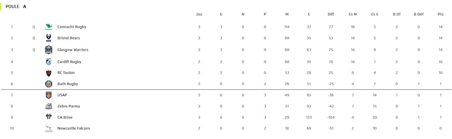 Personne n'était réellement motivé pour ce match et malheureusement, cela s'est vu. Brive a coulé en touche, a coulé en défense avec un nombre incalculable de plaquages manqués (51 !!!) et n'est pas invité à ce niveau là. Avec un tel score, difficile de trouver des satisfactions même s'il n'y a pas de grosses blessures à signaler (à surveiller le protocole commotion de Tuimauga et la sortie prématurée de Tirefort), que les jeunes ont pas mal joué et que certains d'entre eux se sont bien montrés à l'image de Kévin Fabien et Francisco Coria Marchetti notamment. Au Connacht, Brive encaisse sa 2e plus lourde défaite de son histoire en Challenge Cup, derrière la défaite à Edimbourg la saison dernière (66-3). Aussi bizarre que cela puisse paraitre, Brive peut encore se qualifier la semaine prochaine face à Cardiff ! La poule A est totalement scindée en deux.