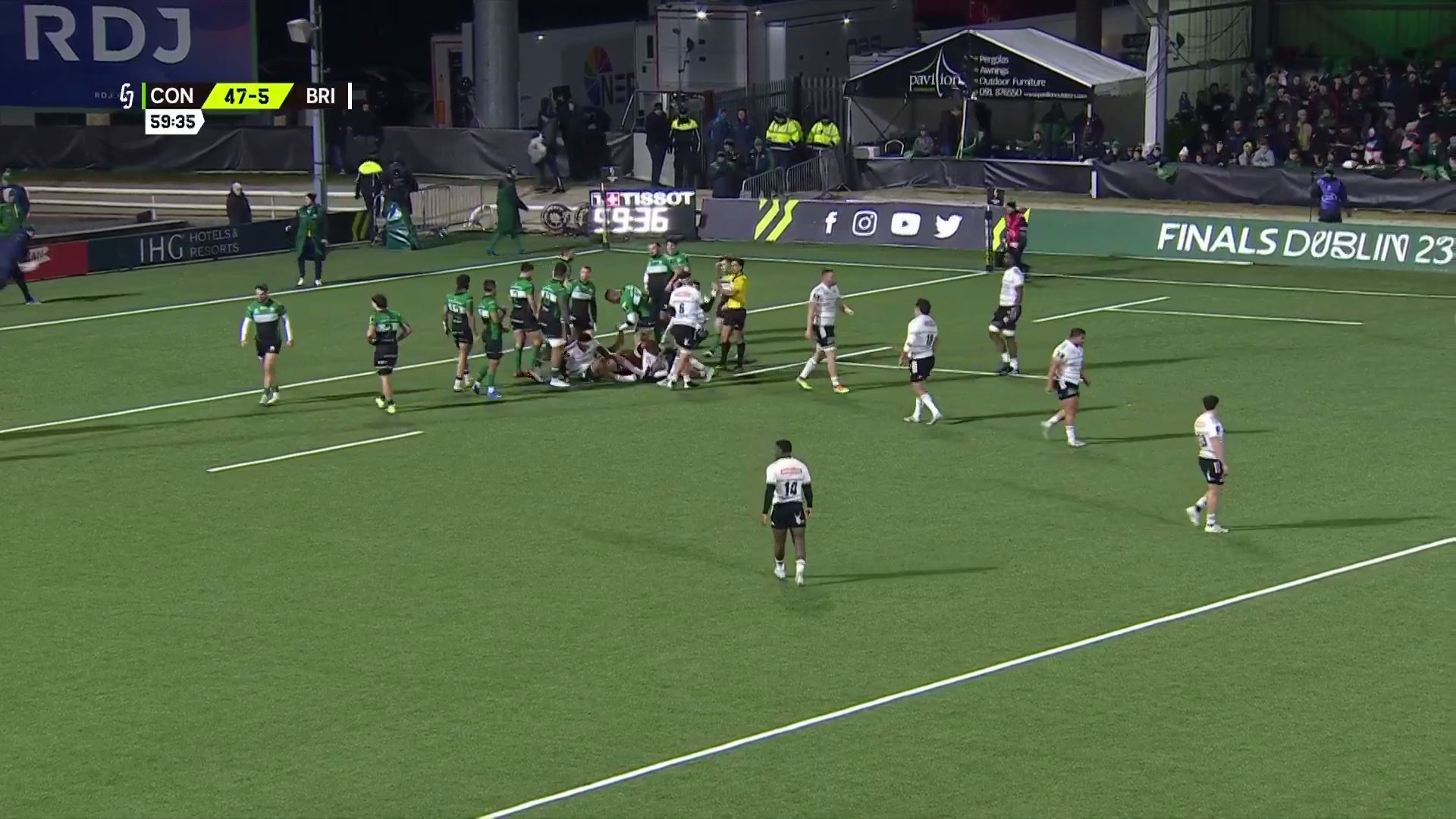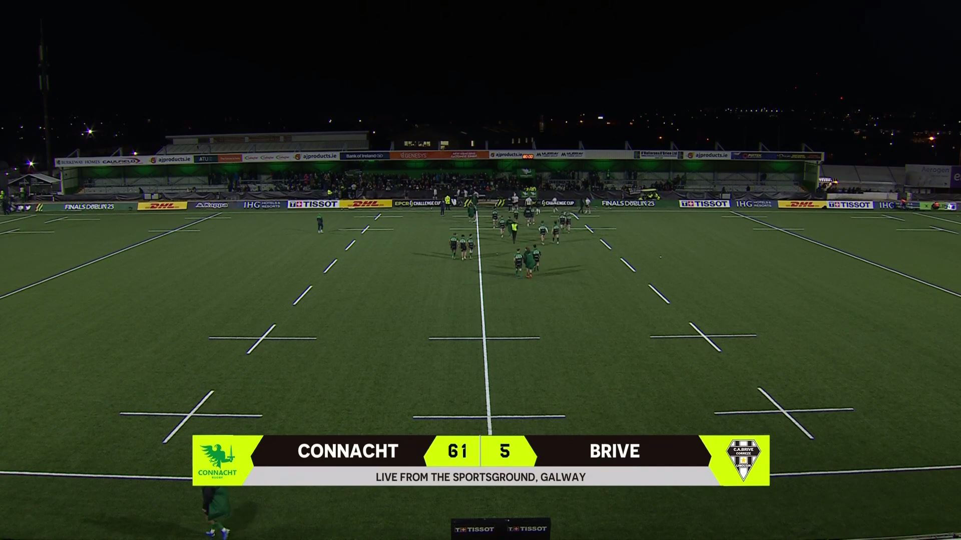 Brive souffre mais a quelques éclairs de génie en attaque. Coria-Marchetti transperce la défense et avance sur une trentaine de mètres. Il a le soutien de Carbonneau qui n'assure pas sa passe vers Maxence Biasotto (56'). La réponse est cinglante. Sur la touche, le Connacht avance vers l'axe avant de revenir petit côté. Le duo infernal Wootton - Hansen s'amuse de la défense et l'arrière passe à Conor Oliver pour déjà le 7e essai irlandais (47-5, 58'). Brive se procure un temps fort dans les 22 mètres irlandais. A la suite d'une touche, Karkadze charge, passe au sol dans les 5 mètres mais le soutien offensif se fait pénaliser. Quelques instans plus tard, nous revoilà proche de la ligne. A plusieurs reprises, on lance Coria Marchetti pour utiliser sa puissance mais la défense parvient à repousser la course du pilier argentin du CAB. Malheureusement, les passes ne sont pas assurées et cela se termine par un en-avant (65').