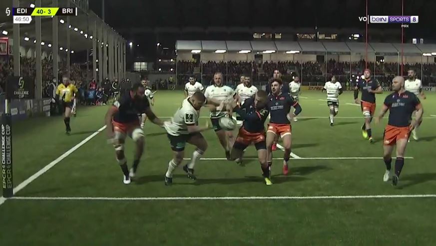 Pas le temps de souffler que le festival reprend. Edimbourg n'est pas rassasié et le démontre. Kinghorn met de la vitesse dans le jeu écossais. L'ouvreur trouve Kunavula qui sert au contact Owsley. L'ailier fait parler à nouveau sa vitesse et s'en va aplatir en coin pour son doublé (40-3, 42'). Brive est à la peine et fait peine à voir. Désormais, on attend seulement une réaction d'orgueil. Le CAB obtient une pénaltouche sur les 22 écossais. Si le ballon est volé, il n'est pas contrôlé par la suite. Vano Karkadze le récupère et s'en va marquer son essai. Sauf qu'il échappe le ballon au contact du dernier défenseur à seulement quelques centimètres de la ligne (47').