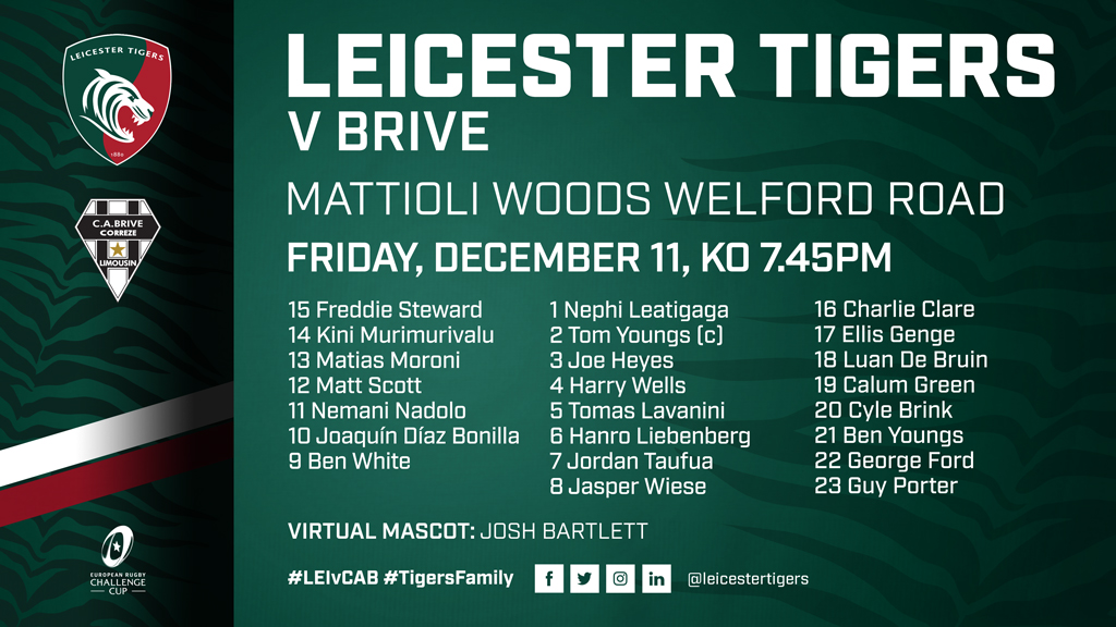 Pour la réception de Brive, Leicester ne peut compter sur Wigglesworth (suspendu), Martin (genou), Woodburn (tibia). Par contre, les Tigers alignent ses internationaux de retour de l'Autumn Nations Cup : B.Youngs, Genge, Ford, Murimurivalu et Nadolo. De retour de blessure, Lavanini est titulaire.