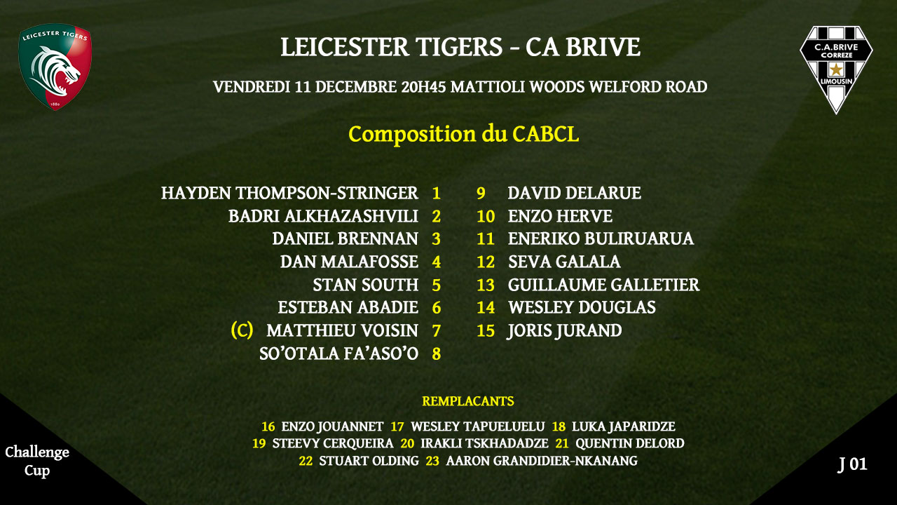 Voici le XV de départ du CA Brive pour le déplacement à Leicester :