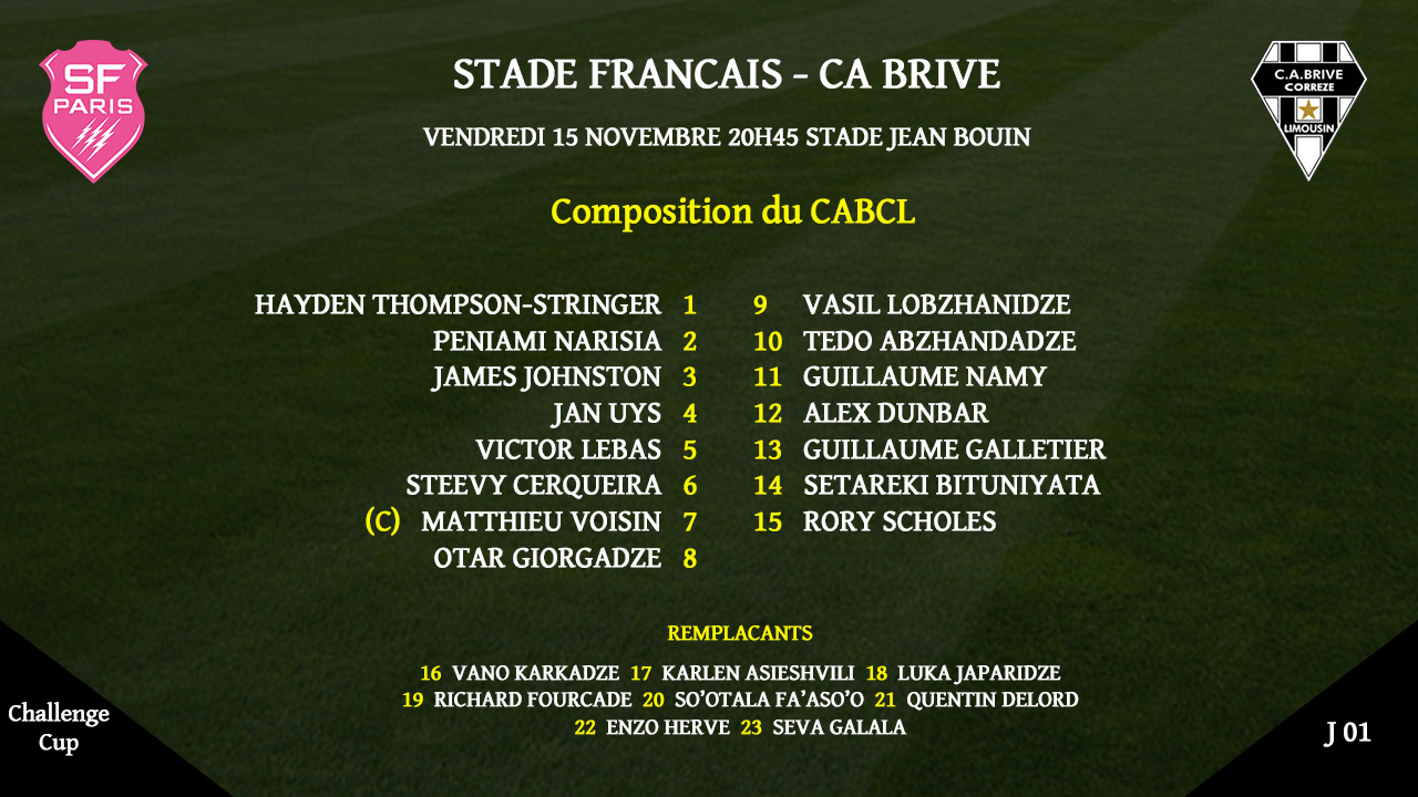 Voici le XV de départ du CA Brive pour le déplacement au Stade Français :