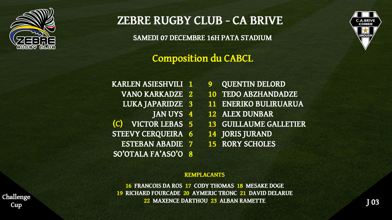 Voici le XV de départ du CA Brive pour le déplacement à Zebre :