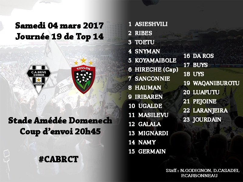 Voici le XV de départ du CA Brive pour la réception de Toulon :