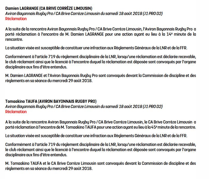 La saison commence et dès les premiers matchs, la commission de discipline a du travail pour les prochaines semaines. Bayonne et Brive se renvoient la pierre en portant réclamation sur un joueur adverse.