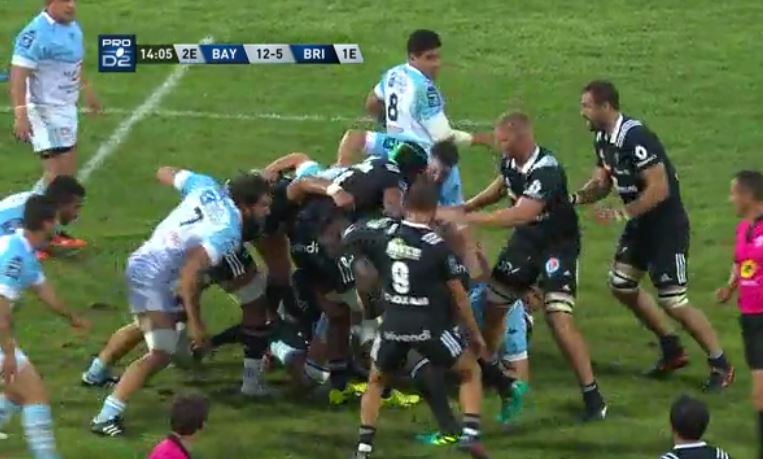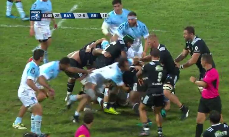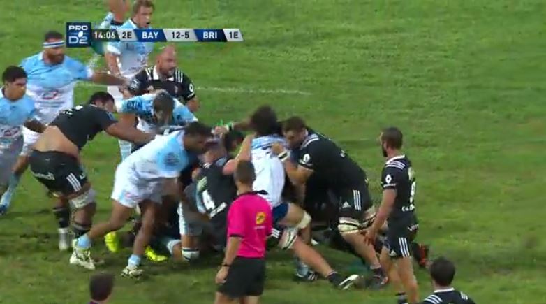 A la 14e minute de jeu, Brive a une touche dans le camp bayonnais. La prise de balle est faite, le maul s'enclenche. En possession du ballon derrière son pack, Demba Bamba est pris par Antoine Battut. Derrière son jeune pilier et peut être pensant que le capitaine bayonnais vient sur le côté, Damien Lagrange effectue un déblayage rugueux sur son vis à vis. Rien n'a été signalé malgré la présence de l'arbitre et de son juge de touche.
