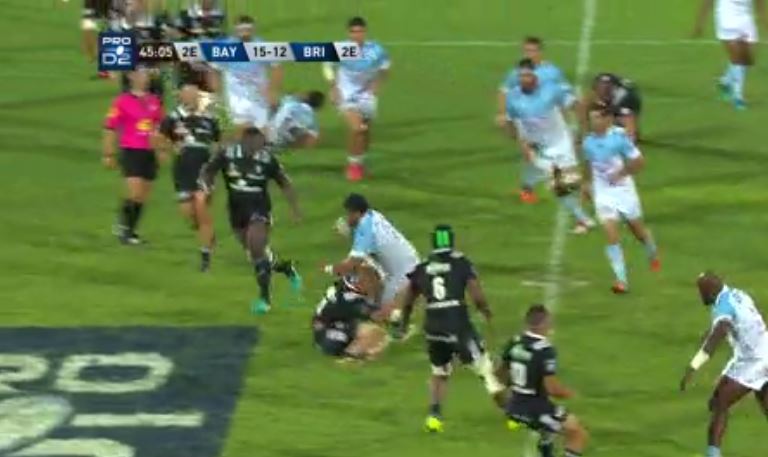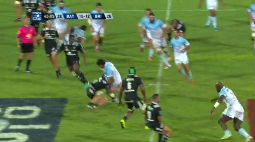 A la 45e minute de jeu, Bayonne est à l'attaque légèrement dans le camp briviste. Après un premier temps de jeu, le ballon arrive sur Toma'akino Taufa, le pilier remplaçant entré en fin de première période. Il charge sur Peet Marais mais il charge le coude en avant semble-t-il. Là encore, rien n'a été signalé durant la rencontre.