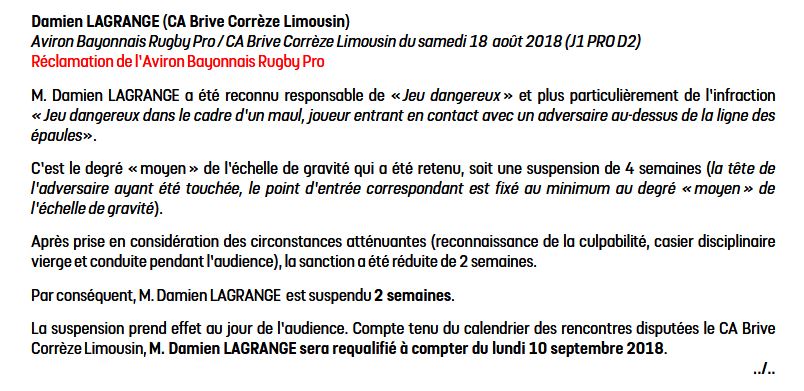 Le match à Bayonne ne s'est pas terminé le jour du match et a eu droit à des prolongations. Chaque club a cité un joueur adverse pour une action dangereuse. Damien Lagrange est le briviste cité pour un déblayage appuyé. En direct, aucune sanction malgré la présence de deux arbitres à proximité de l'action.