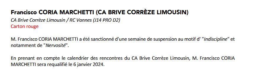 Après passage devant la commission de discipline, Francisco Coria Marchetti écope d'une semaine de suspension pour indiscipline et nervosité. Il manquera le déplacement à Biarritz et sera requalifié pour la réception de Rouen. Aucune mention dans le PV pour Marcel Van der Merwe donc rien à signaler pour le pilier sud-africain du CAB qui sera bien présent pour le déplacement à Biarritz.