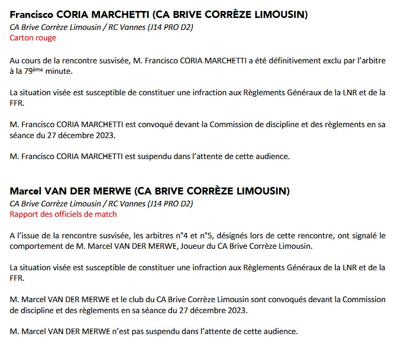 Mercredi prochain, deux jours après Noël, Francisco Coria Marchetti et Marcel Van der Merwe passeront en commission de discipline. Pour la reprise du championnat, l'absence de l'argentin est acquise (reste à savoir la durée de la suspension) tandis que cela pourrait être un simple avertissement pour le sud-africain.