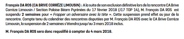 Pour avoir donné un coup de tête à l'ailier de Pau Votu, le talonneur briviste écope de 2 matchs de suspension. Il sera de retour pour le match contre Clermont.