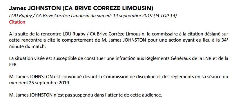 Après le match contre Clermont, Brive n'a envoyé personne en commission de discipline. Mais après Lyon, le CAB est de retour en commission de discipline. A la 35e minute, Félix Lambey charge, James Johnston va pour le plaquer mais son bras, dans un 2e temps, heurte le visage du 2e ligne lyonnais qui continue son action qui va déboucher sur le 4e essai du LOU. Après visionnage des images, le pilier briviste écope d'un carton jaune.
