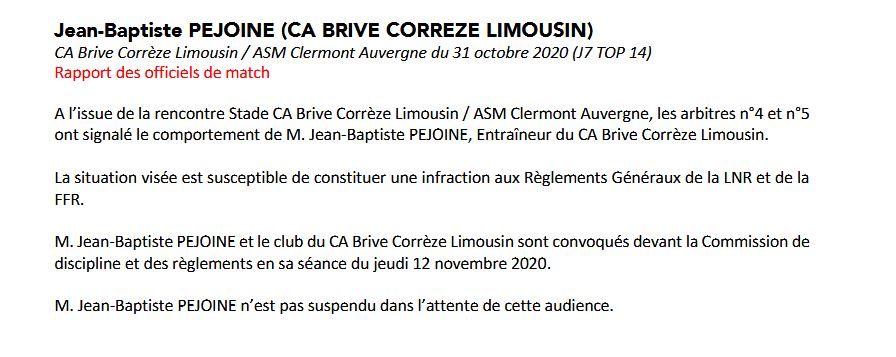 Samedi, c'était le derby entre Brive et Clermont. Tout ne s'est vraiment pas passé comme prévu pour le CA Brive qui s'est incliné lourdement sur le score de 43 à 21, encaissant une 3e défaite de rang, la première depuis sa remontée dans l'élite. Si Mitch Lees et Setareki Bituniyata en terminent avec leur suspension, un autre membre du CAB va devoir se présenter devant la commission de discipline : Jean-Baptiste Péjoine. Au cours de la rencontre, il a eu un comportement inapproprié, rapporté par les 4e et 5e arbitres et a été convoqué lors d'un arrêt de jeu par Cédric Marchat.